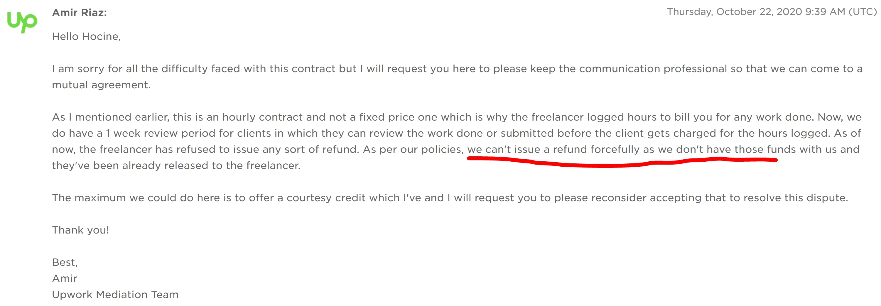 If I didn't have such strong principles I would have just let them keep my money the mediation process was not worth the abuse I endured at the hands of the con and the one sided devious UpWork employee mediator. Of course upwork doesn't get paid anything if the freelancer doesn't get paid so naturally they will side with the Freelancer, Even after I eventually won my right to a refund I had to again call email and fight to get it returned to my bank account. And still waiting 60 days later.